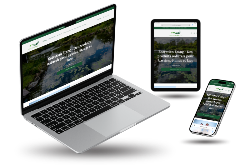 Un site e-commerce professionnel, simple à naviguer et optimisé pour convertir, renforcé par une stratégie de communication digitale performante. Grâce aux contenus visuels et aux campagnes ciblées, Entretien Étang a pu se positionner rapidement sur un marché de niche et développer sa notoriété en ligne.